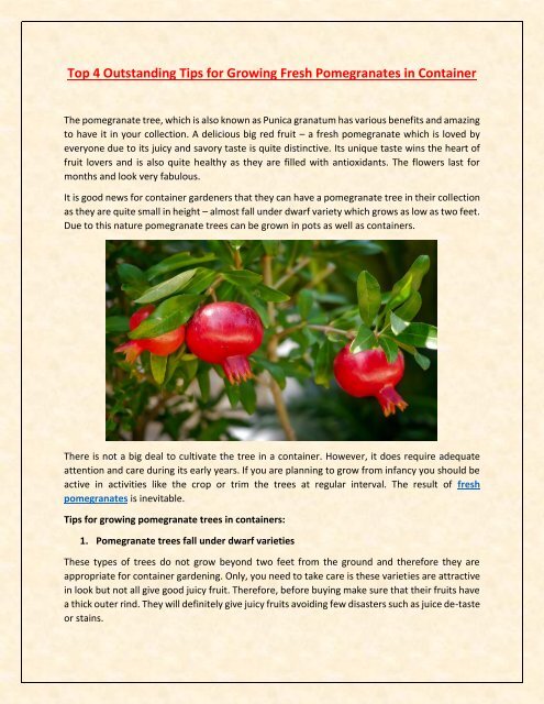 Requirements for growing pomegranates in pots if you've grown citrus in a pot, growing pomegranates in a pot cannot be difficult for you. Small, dwarf and bonsai pomegranate varieties Position in full sun and protect from strong winds. Pomegranates are perfect pot specimens, particularly dwarf forms like 'nana', which only grow to 1m. Like most trees growing in containers, pomegranate trees will need regular fertilizing.